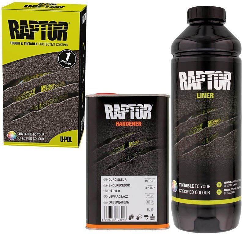 U-POL RAPTOR - Tvrdý a tónovateľný 2K polyuretánový nástrek, ktorý chráni povrch ochrannou vrstvou. Vyrába sa v dvoch verziách: čierny a transparentný. Zabezpečuje tvrdý povrch odolný mechanickému poškodeniu a škvrnám. Chráni pred hrdzou. Poskytuje vysoký stupeň odolnosti proti blednutiu. Poskytuje vode odolný povrch, ktorý odpudzuje vlhkosť a znižuje účinky hrdze. Odolnoný proti širokému spektru chemikálií, vrátane pohonných hmôt, hydraulických olejov, zvieracieho moču, slanej vode a ďalšie. Poskytuje výbornú priľnavosť na celú radu materiálov. Môže byť použitý s UBS pištolou, HVLP pištolou, valčekom alebo štetcom. Jednoduché použitie: Naplniť-Zatriasť-Striekať.